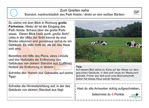 Zuerst müssen allerdings die Standorte, an denen die Aufgaben gelöst werden können, gefunden werden. Dabei hilft der Plan oder ein GPS-fähiges Gerät. Auch ein Kompass kann nützlich sein.