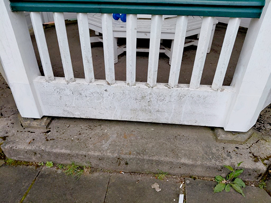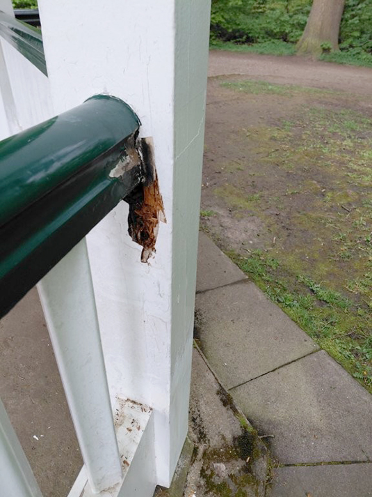 Verrotteter Geländeransatz am Stützbalken des Gerdes Pavillon